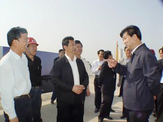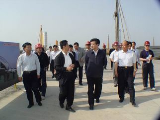 2008年5月5日下午,許立全市長視察建設(shè)中的奧體中心工程。董事長徐鵬強(上圖左一)陪同視察。