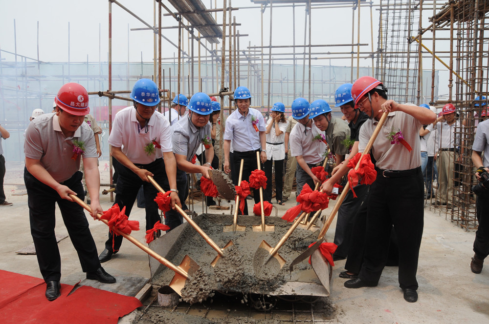 6月16日上午11時16分,由第二分公司承建的泰華城•榮觀華府工程舉行了主體封頂儀式。集團公司董事長徐鵬強、總經(jīng)理朱九洲,建設(shè)單位泰華集團董事長劉云江,監(jiān)理單位董事長曹金彩等領(lǐng)導(dǎo)出席封頂儀式并為泰華城•榮觀華府工程裝填最后一車封頂砼。參加封頂儀式的還有來自建設(shè)單位、施工單位、監(jiān)理單位及參建單位的200多名代表。 泰華城•榮觀華府工程是濰坊市唯一的商業(yè)CBD項目,工程位于美麗的白浪河畔。本期項目總建筑面積216673平方米,工程基礎(chǔ)采用CFG復(fù)合地基,2m厚的筏板基礎(chǔ),地下三層和地下二層為車庫,地下一層至四層為商業(yè),五層至二十九層為公寓。工程采用流線型設(shè)計,從空中看像游戈在白浪河中一條巨大的彩魚,從側(cè)面看像停泊在白浪河畔的一艘巨大的航母,1#東西塔樓像兩個巨大的風(fēng)帆。該工程自2010年4月15日筏板基礎(chǔ)圖紙出具以后正式開工建設(shè),第二分公司項目部組織人員搶工期,抓質(zhì)量,保形象,克服了施工現(xiàn)場狹小、工程結(jié)構(gòu)復(fù)雜、施工穿插組織難度大等各方面困難,歷時368天,以比原計劃工期提前26天的優(yōu)異成績封頂,同時實現(xiàn)優(yōu)質(zhì)、安全,贏得了建設(shè)單位和監(jiān)理單位的高度稱贊。該工程的提前順利封頂,為昌大和泰華兩個集團公司以后的戰(zhàn)略合作夯實了基礎(chǔ),埋設(shè)了基石,譜寫了輝章。