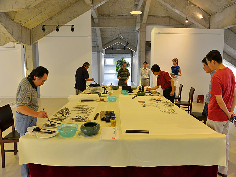 筆會現場,書畫家們興致勃勃、揮毫潑墨,為昌大美術館獻寶。