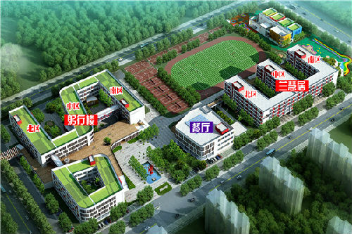 建筑面積23.5萬平方米,項目用地被兩條T字交叉的道路分隔為南北兩個部分。初中、高中位于北側面積較大的地塊,小學、幼兒園位于南側較小的地塊。