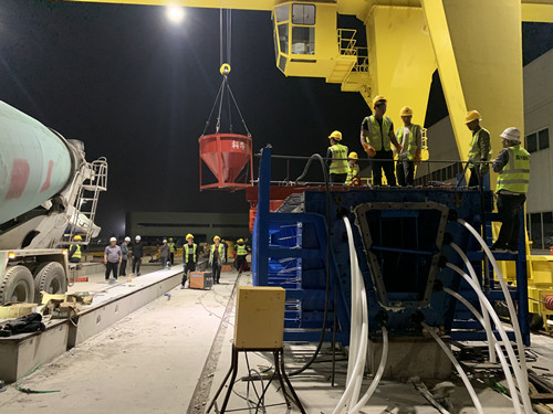 2021年5月7號凌晨3:00,集團承建濰坊寶通街高架快速路工程項目首件預制箱梁歷經3個小時順利完成澆筑。標志著集團為寶通街高架快速路工程而建設的預制梁場正式投入生產。集團總裁朱九洲親臨現場指導,副總裁閆鵬陪同。