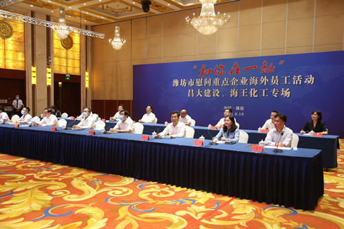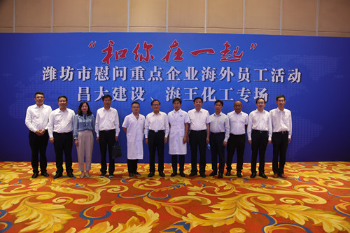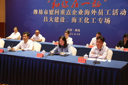 2021年8月19日下午,濰坊市政府外事辦舉辦主題為“和你在一起”慰問重點企業員工昌大集團、海王化工專場活動。活動由濰坊市政府外事辦公室主任葛英煜主持,濰坊市市政府黨組成員陳汝孝、中國駐卡塔爾大使館經商處參贊楊松、中國駐老撾大使館經商處參贊趙文宇以及市衛健委、市外事辦有關負責人以及市屬醫院醫護專家出席。集團副總裁吳杰出席活動并代表集團通過互聯網向奮戰在海外的一線員工表達深切地問候和關懷。