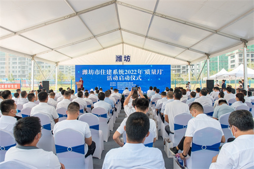 在今天濰坊“質量月”活動啟動儀式上,與會人員在現場通過網絡觀看了全省在臨沂主會場,主題為“推動質量變革創新、促進質量強國建設、建設品質工程、筑就美好生活”的質量月活動啟動儀式。在主會場儀式上,有主會場當地領導和省廳有關領導的致辭講話、有部署全省住建系統質量月活動安排、觀看《匠心筑夢質享未來》工程質量提升成果專題片、通報山東省近十年爭創魯班獎和國家優質工程獎情況、為2021年優質結構獎代表頒發證書、為“天元大工匠”代表頒發證書,建設、施工、勘察、設計、監理、檢測等行業代表宣讀關于落實工程質量的倡議書、各地市質量提升成果展示等等。在濰坊啟動儀式上,項目建設單位、總承包施工企業和監理企業代表作了表態發言。