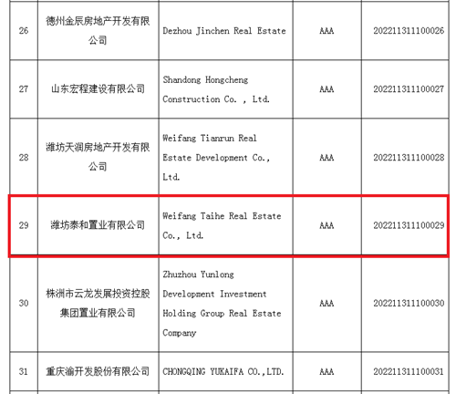 2022年12月27日,中國(guó)房地產(chǎn)業(yè)協(xié)會(huì)公布了2022年全國(guó)房地產(chǎn)開(kāi)發(fā)企業(yè)信用評(píng)價(jià)等級(jí)結(jié)果,全國(guó)43家房地產(chǎn)開(kāi)發(fā)企業(yè)經(jīng)嚴(yán)格、公正評(píng)審后獲評(píng)信用等級(jí)。集團(tuán)泰和置業(yè)榮獲此次信用評(píng)價(jià)的最高等級(jí)——AAA級(jí),這也是泰和置業(yè)繼2016年、2019年獲評(píng)AAA級(jí)后,再次獲得國(guó)家權(quán)威機(jī)構(gòu)的肯定。