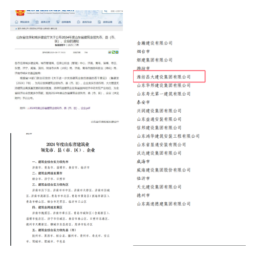 近日,山東省住房和城鄉(xiāng)建設(shè)廳發(fā)布了《關(guān)于公布2024年度山東省建筑業(yè)領(lǐng)先市、縣(市區(qū))、企業(yè)的通知》(魯建建管字[2025]5號)。集團公司被評為2024年度山東省建筑業(yè)領(lǐng)先企業(yè)。